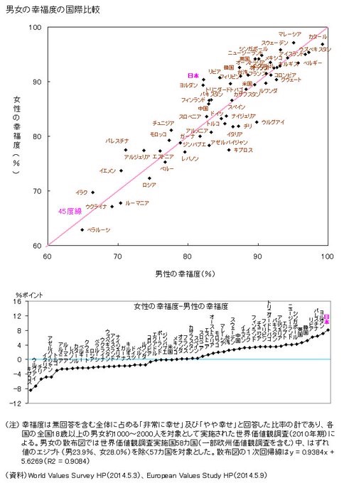 更に世界の女性の幸福度と男性の幸福度比較において、女性の幸福度が男性の幸福度より世界一高い。