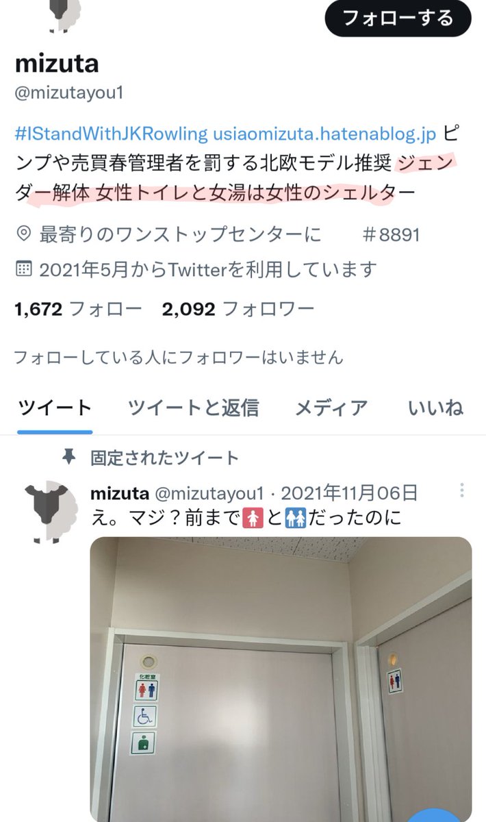 で、ジェンダー解体も意味わからんけどジェンダーレスとしても、女性トイレと女湯は女性のシェルターって、解体できてなくて大草原不可避 https://twitter.com/mizutayou1/status/1576382242682642433 … pic.twitter.com/83UhFeeUMz
