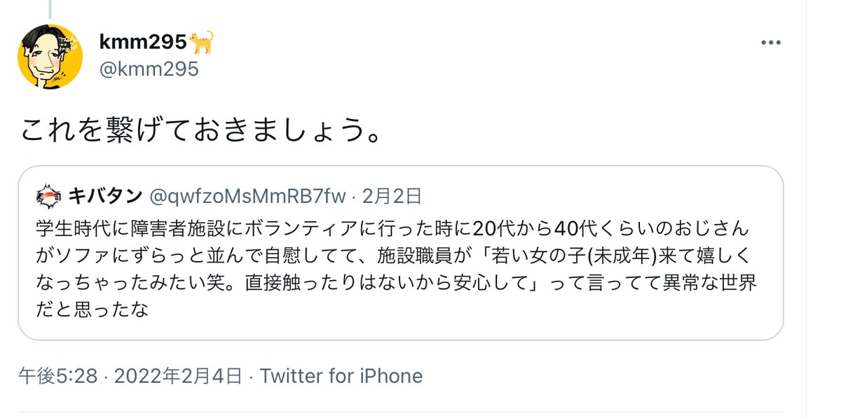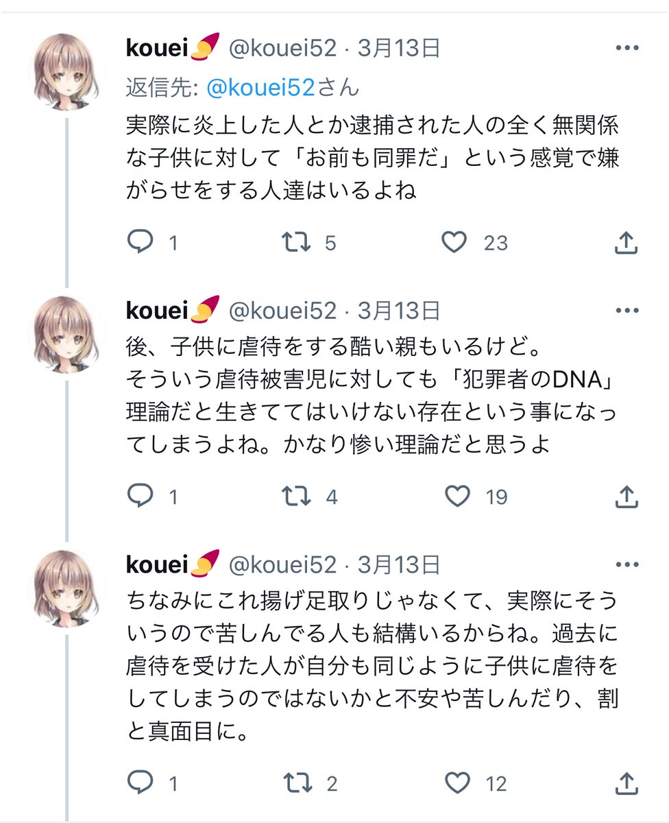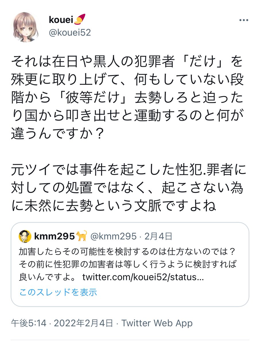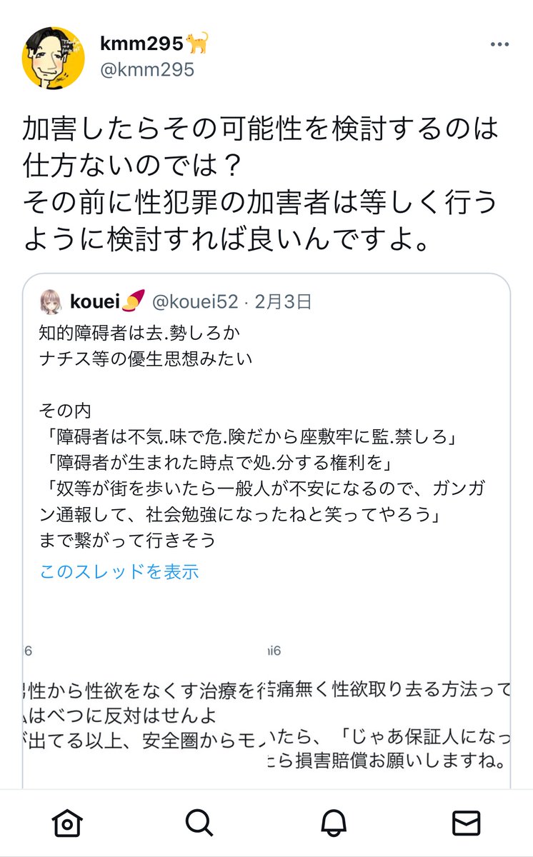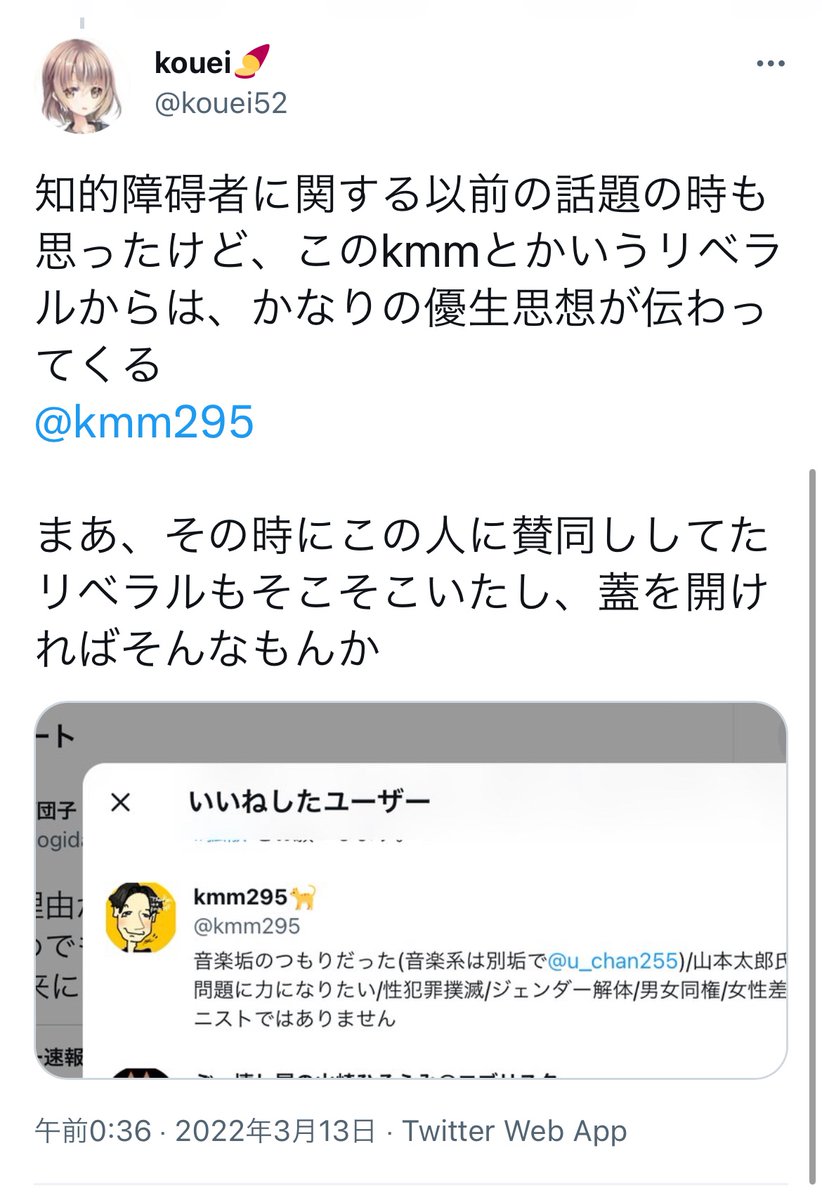 この人物は過去には障碍者に対する去勢や犯罪者の子供に対する差別にも賛同していたり、正義と綺麗事のガワを被った優生思想寄りの人間なんだよね https://twitter.com/kmm295/status/1589494113661243394 …