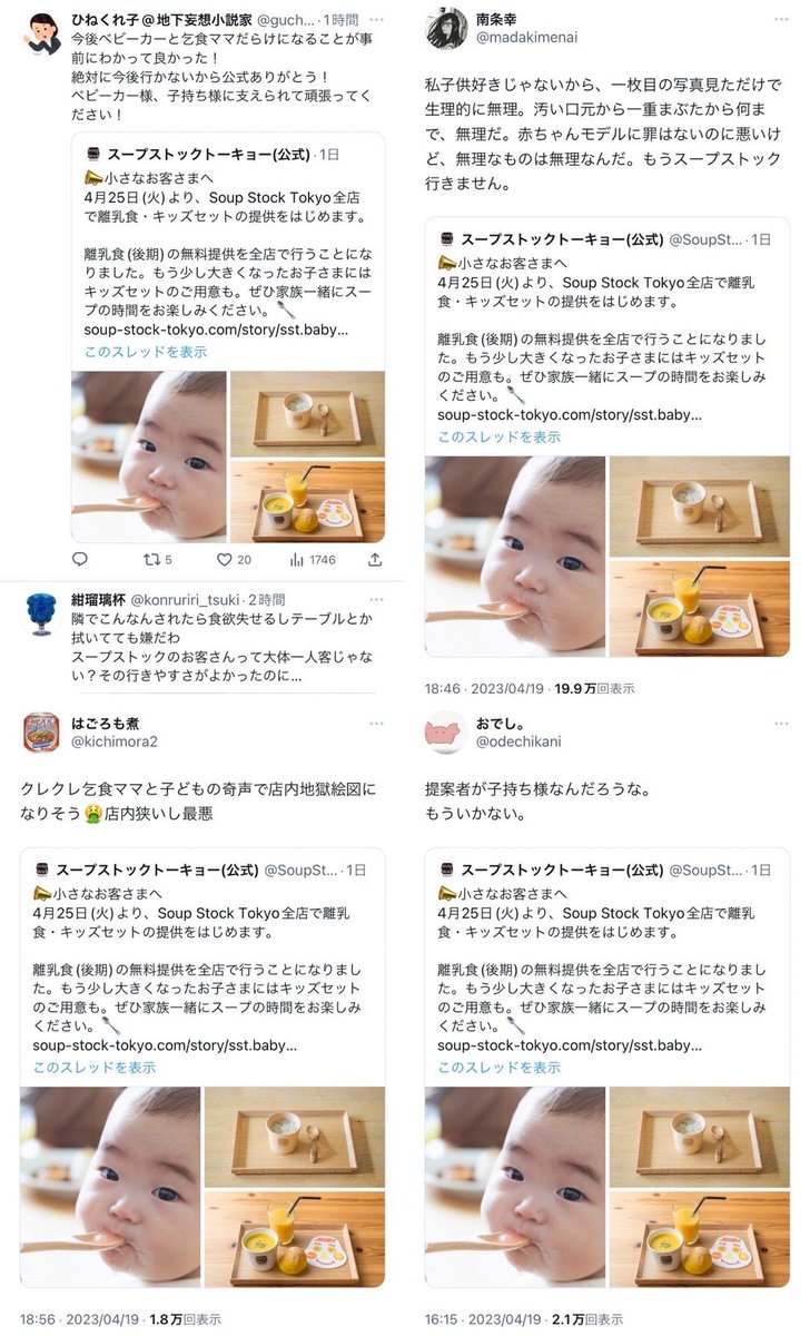 離乳食の無料サービスを全店舗に拡大しただけで、子連れの母親や赤ちゃんを罵倒したアカウントは反省した方がいいですよ。 pic.twitter.com/xYK3ECUduM