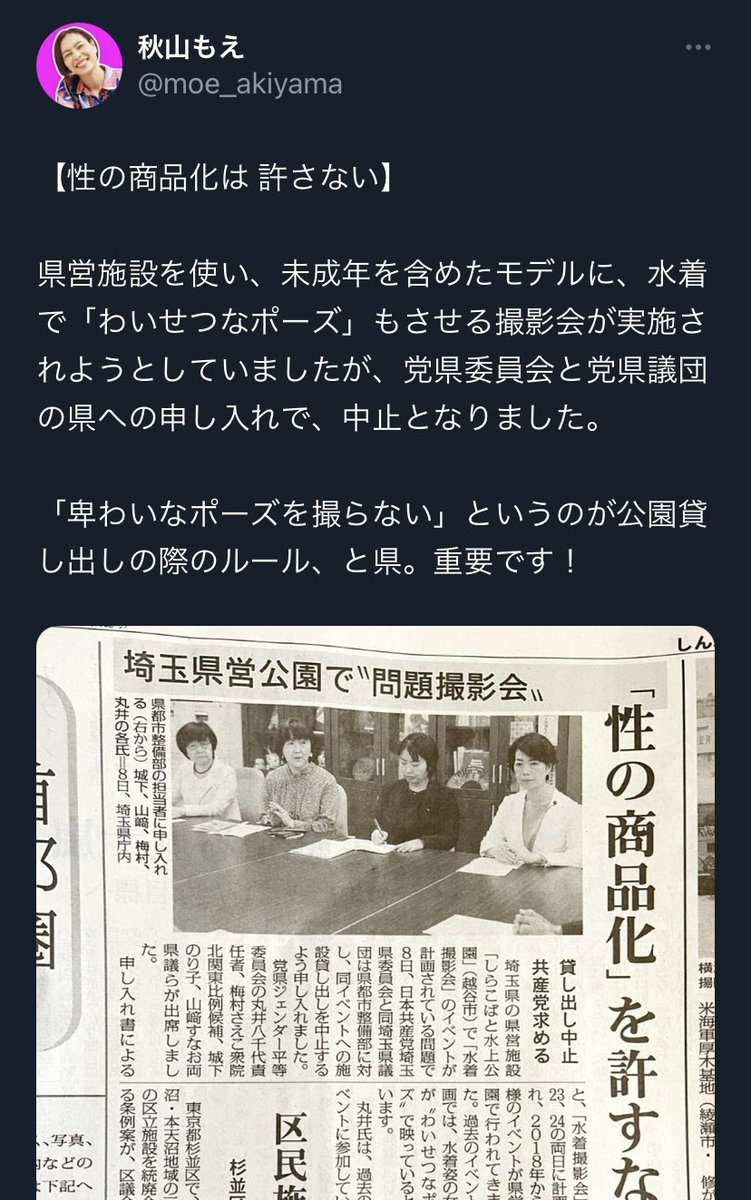 【前埼玉県議】共産党フェミニストが自白か「共産党の申し入れで、水着撮影会は中止となりました!」