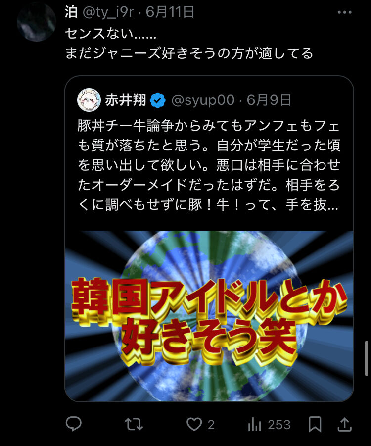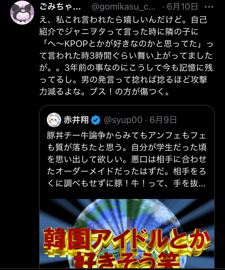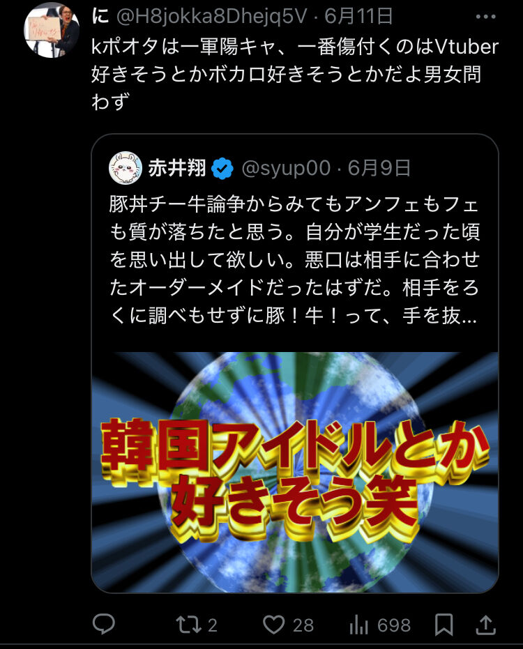 X女性「K-POP好きな子は一軍のオシャレな子のイメージだからむしろ言われたら舞い上がる BL好きそう 銀魂好きそう ボカロ好きそう 男性Vtuberとか好き?これが効く」